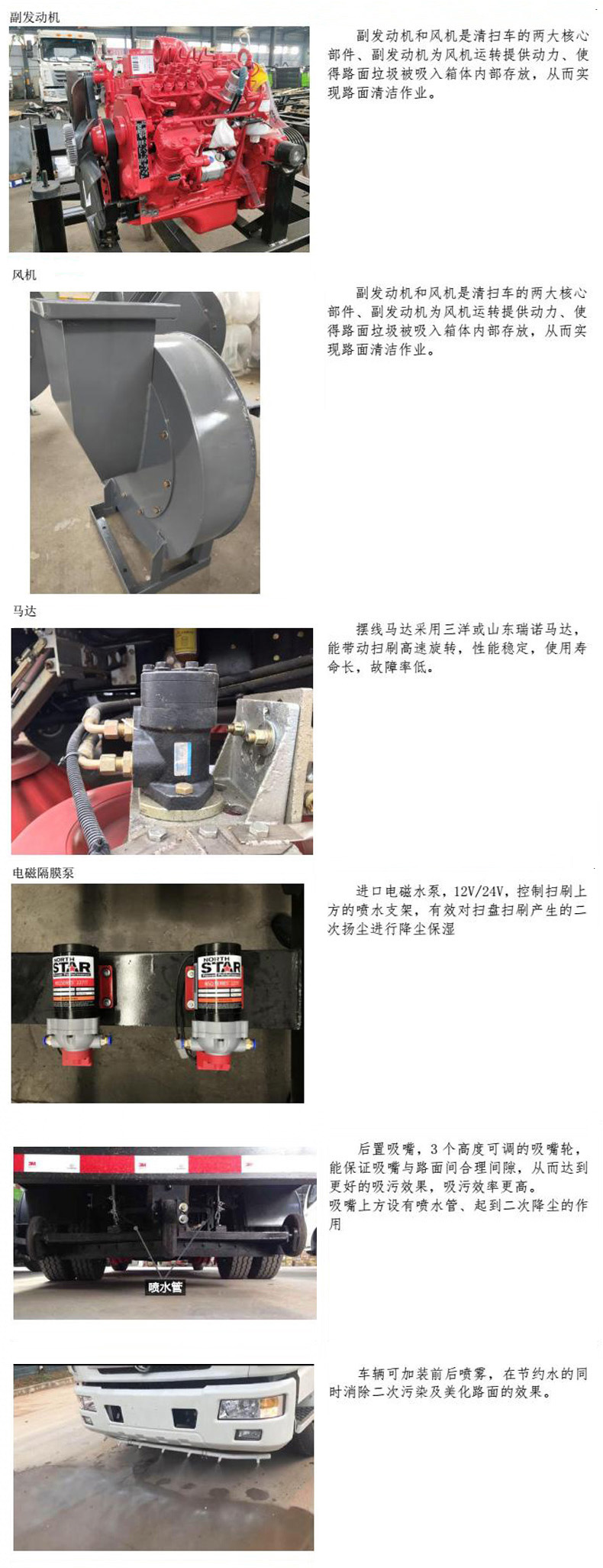 1、中置4掃盤后置吸盤、注轉77馬九副機、三洋擺線馬達,施耐德控制開關、海音瑞斯電財間組、百光富電控、免維護分離式離合器、免維護離心風機、碳鋼水箱,不銹鋼垃圾箱、垃圾箱舉升自卸、尾部L箭頭行。北極星電子水泵、清日寬度24-3.2米 、吸入粒度120mm(選裝東風88馬力、江鈴87馬力增壓付機,可加裝前沖后酒,垃圾箱自潔、葡噴霧、電子水炮、霧炮、雪護、雪刷、價格電議)、不銹鋼垃圾箱內膽,碳鋼水箱;尾部LED箭頭燈,手動泵應急系統。