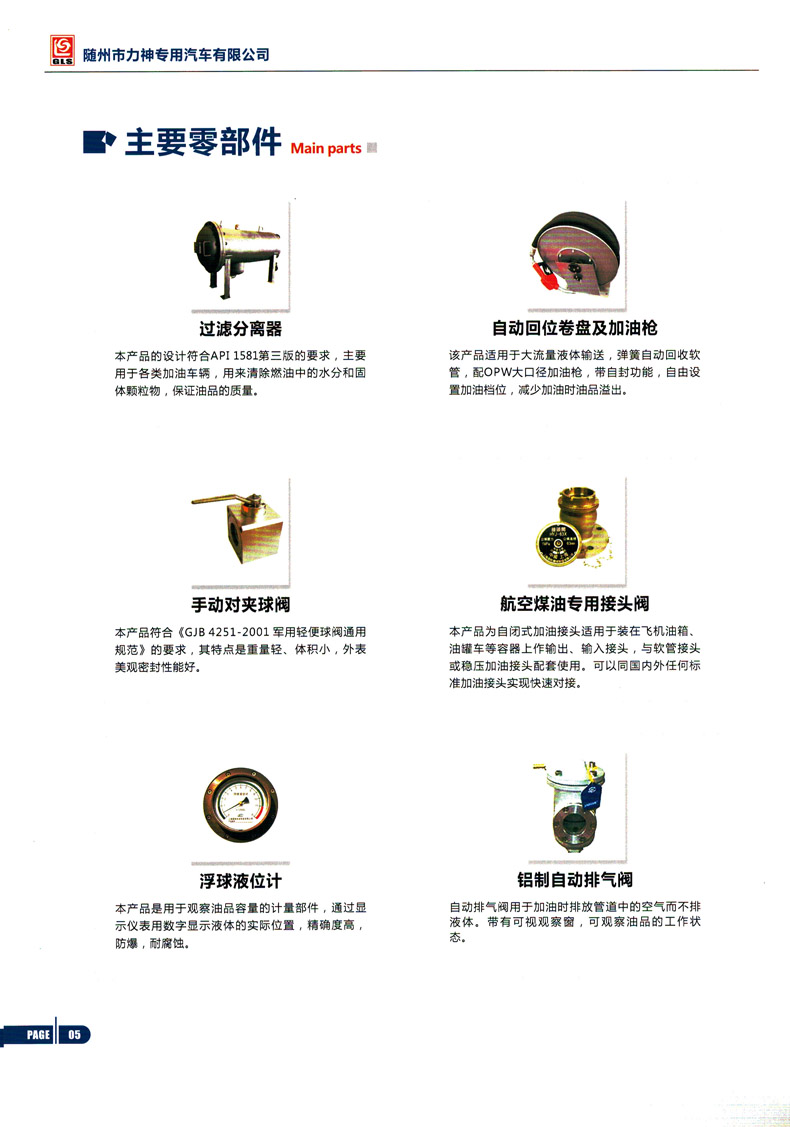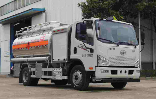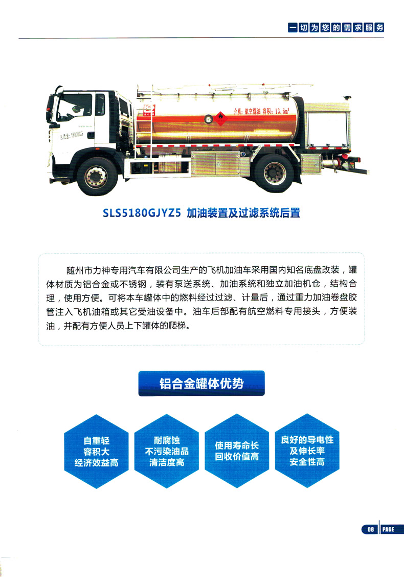 罐體有效容積:8.13立方米,危險貨物運輸車輛的類型為FL型,介質:航空汽油,航空煤油;類項號:3;加油裝置上置時,罐體尺寸(長×長軸×短軸)(mm)為:3800×1950×1400;加油裝置下置時,罐體尺寸(長×長軸×短軸)(mm)為:4700×1750×1250;僅采用3900mm軸距;隨底盤選裝駕駛室,選裝加油裝置下置,選裝箱門樣式;側、后防護裝置材料材質:Q235B,側、后防護均采用螺栓連接,后防護裝置斷面尺寸為(mm):80×150,后部防護離地高度:450mm;安裝具有衛星定位功能的行駛記錄儀;安裝排氣管前置,前盤制動,限速裝置,限速80km/h,僅采用底盤子午線輪胎;ABS生產廠家/型號:1.廣州瑞立科密汽車電子股份有限公司/CM4XL-4S/4M;2.浙江萬安科技股份有限公司/VIE ABS-II.轉向輪安裝爆胎應急防護裝置.