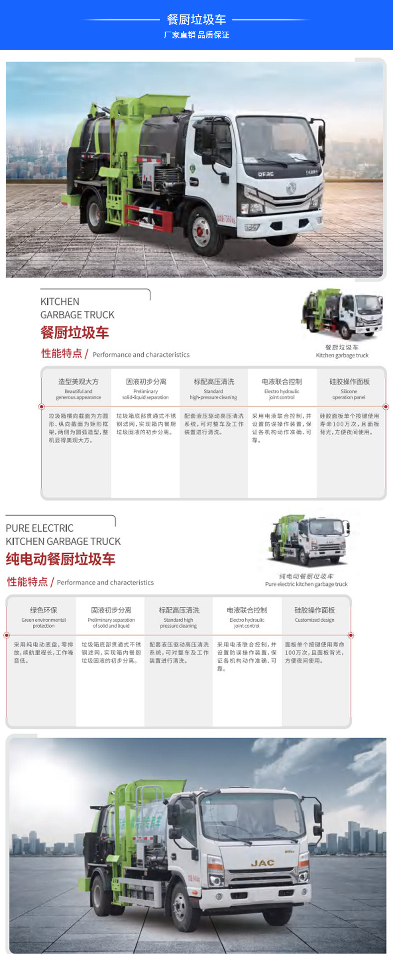 垃圾車價格_純電動垃圾車_東風小型純電動餐廚垃圾車★13908669111★產品名稱CSC5080TCAJH6BEV型純電動餐廚垃圾車,采用東風EQ1080TTZEVJ1底盤改裝而成,該車用于餐廚垃圾收集清運,主要專用裝置為箱體、上料提升機構等組成.標配固液初步分離,垃圾箱底部貫通式不銹鋼濾網,實現箱內餐廚垃圾固液的初步分離。標配高壓清洗配套液壓驅動高壓清洗系統,可對整車及工作裝置進行清洗。更多垃圾車盡在:www.pkubrand.cn