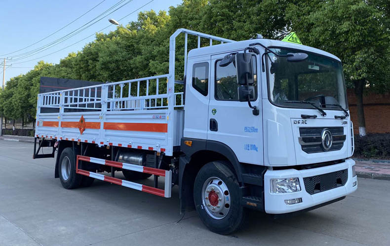 該車為危險貨物運輸車.運輸獨立容器(瓶)包裝的貨物;危險貨物類項號:2.1,2.2.側,后防護材料均為Q235,側防護螺栓連接;后防護焊接,截面尺寸120×50mm,下邊緣離地高490mm.選裝后部無尾板,選裝后部無尾板時,后防護焊接,截面尺寸120×60mm,下邊緣離地高490mm.選裝欄板樣式,選裝柵欄樣式.僅選用排氣管前置,安裝限速裝置(限速80km/h),前輪盤式制動及子午線輪胎的底盤.后軸采用空氣懸架.轉向輪安裝輪胎爆胎應急防護裝置,該車可選裝直接供電式ETC車載裝置.安裝帶有衛星定位功能的行駛記錄儀.隨底盤選裝電瓶,尿素罐,儲氣筒安裝位置.EBS系統生產廠家,型號:襄陽東風隆誠機械有限責任公司,EBS/ESC-d.發動機與油耗值(L/100Km)對應關系為:B6.2NS6B230/26.7,D4.5NS6B220/26.6,YCS04200-68/26.4,CY4SK761/26.8.液壓升降尾板收起狀態水平長度為290mm,尾板質量為550kg.僅采用底盤4700mm,5300mm軸距改裝.隨底盤選裝駕駛室,選裝前組合燈具,前面罩和后視鏡.
