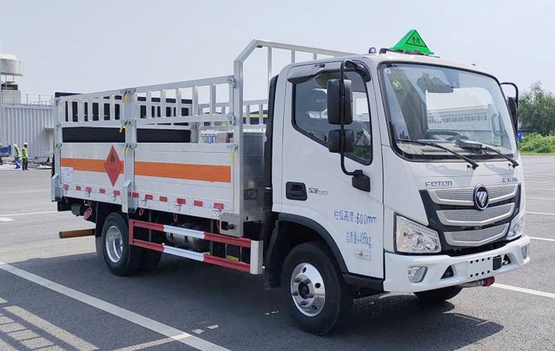 該車適用于運輸危險品,用于運輸具有獨立容器(瓶)包裝的物品,運送危險類項號:2.1,2.2.運輸易燃氣體時掛2.1類警示牌,運輸非易燃無毒氣體時掛2.2類警示牌.側、后防護材料均為Q235,螺栓連接,后防護截面尺寸(mm)φ100,下邊緣離地高450mm.液壓尾板收起狀態水平長度為280mm,尾板質量為350kg.選裝后部無尾板時,側、后防護材料均為Q235,螺栓連接,截面尺寸(mm)100×50,下邊緣離地高450mm.僅選用軸距3360mm.僅選用排氣管前置、限速裝置(限速80km/h)、前輪盤式制動及子午線輪胎的底盤,轉向輪裝備輪胎爆胎應急防護裝置.安裝帶有衛星定位功能的行駛記錄儀.ABS型號/生產廠家:ABS-E/威伯科汽車控制系統(中國)有限公司,ABS-VI·E/廣州瑞立科密汽車電子股份有限公司,YF8/武漢元豐汽車電控系統有限公司.發動機/油耗值(L/100Km)對應關系為: D25TCIF1/11.16,F2.5NS6B131/11.27.整備質量不含備胎,含滅火器及隨車工具,貨箱重量300kg,底板鋁合金,厚度30mm,邊板材質鋁合金,厚度40mm.該車型可選裝直接供電式ETC車載裝置.隨底盤選裝排半駕駛室,選裝前圍及前部燈具.廂體選裝無柵欄,選裝柵欄樣式,選裝貨箱箱板結構.選裝尾板樣式.隨底盤選裝前臉標識.
