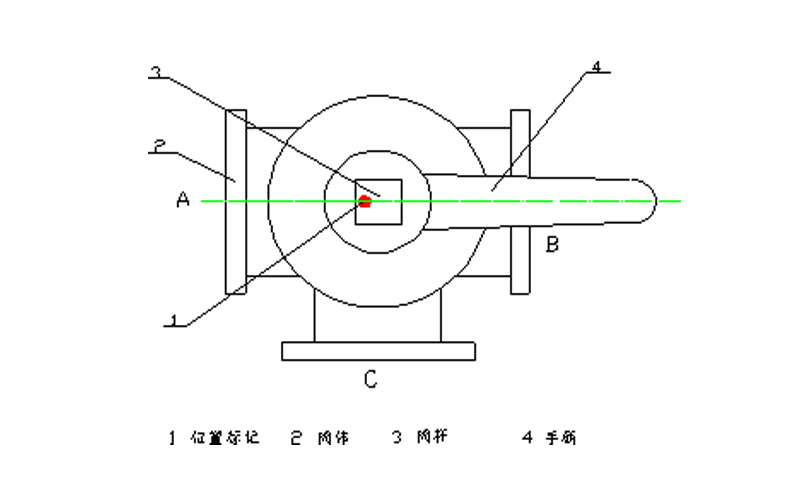 加油車控制閥采用的為四位三通球閥,結(jié)構(gòu)如圖所示,在使用過程中,閥桿上紅點(diǎn)所對應(yīng)的方向表示此方向處于關(guān)閉狀態(tài)。圖示的位置表示A方向處于關(guān)閉狀態(tài),B與C相通。