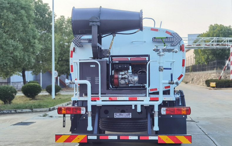 消防灑水車安裝消防車專用消防泵、消防炮、消防取力器。罐體后帶工作平臺,平臺上安裝綠化灑水炮,灑水炮可全方位旋轉,帶前沖后灑,帶側噴,可連續(xù)調(diào)成直流狀、霧狀、大雨、小雨、毛毛雨,帶安全護欄。罐體頂部安裝消防水炮。帶消防接口,可通過消防栓進水,帶自流閥,消防綠化卷盤。