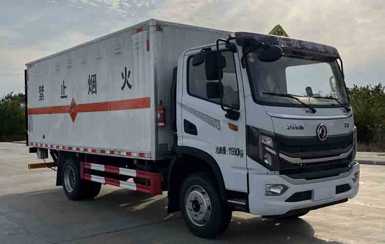 該車為危險品運輸車.車廂頂部封閉,不可開啟.運輸具有獨立容器包裝的介質,危險貨物運輸車輛類型:EX/Ⅲ,危險貨物類別號:1.1B,1.1C,1.1D,1.1G,1.2C,1.2D,1.2G,1.3G,1.4C,1.4D,1.4G.后部帶液壓尾板時,側、后防護材料均為Q235,連接方式均為螺栓連接,后防護截面尺寸φ120mm,下邊緣離地高450mm.選裝后部無液壓尾板時,后防護材料為Q235,焊接連接,后防護截面尺寸100×50mm,下邊緣離地高450mm.液壓尾板收起狀態水平長度為300mm,起重尾板質量為420kg.僅采用前輪盤式制動器,前置排氣管,子午線輪胎, 安裝限速裝置,限速80km/h;轉向輪安裝爆胎應急防護裝置;發動機型號及油耗值對應關系為(L/100km):YCY30165-60/19.7,D30TCIF1/19.8.ABS型號/生產廠家:3631010-C2000/東科克諾爾商用車制動系統(十堰)有限公司,J ABS/焦作博瑞克控制技術有限公司.該車型可選裝直接供電式ETC車載裝置,該車安裝具有衛星定位功能的行駛記錄儀.僅采用底盤3800mm軸距改裝.隨底盤選裝駕駛室,選裝窄輪罩.廂體側面選裝不同形式側開門及開門位置或不帶側門.選裝百葉窗,選裝瓦楞板結構,選裝后門和側門雙門桿.選裝液壓尾板樣式.選裝不帶液壓升降尾板結構;隨底盤選裝電瓶框,尿素罐,油箱布置位置.