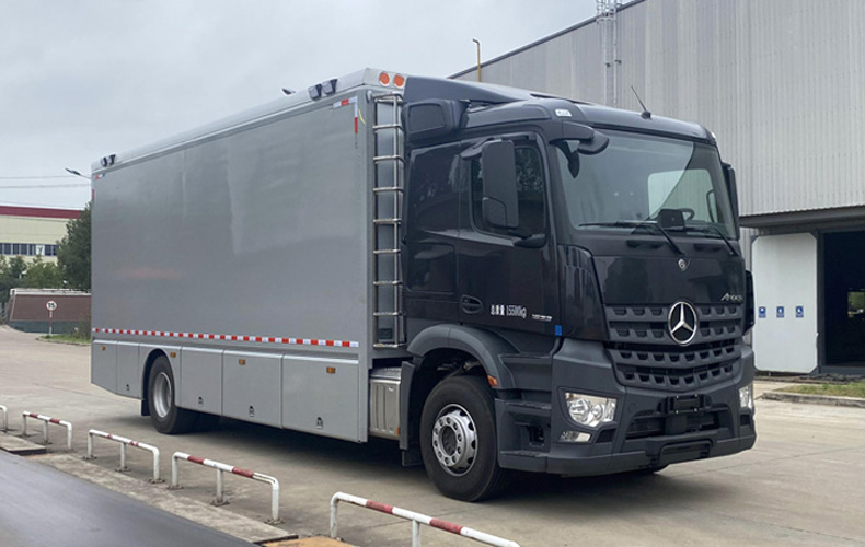 車(chē)頂封閉切不可開(kāi)啟。該車(chē)主要用于戶外維修,主要專(zhuān)用裝置為工具柜,線纜盤(pán),工具箱,絞盤(pán),電焊機(jī),空氣壓縮機(jī)。側(cè)后防護(hù)均采用裙邊結(jié)構(gòu),后防護(hù)下邊緣離地高度500mm。EBS系統(tǒng)型號(hào)/生產(chǎn)企業(yè)為:EBS4+/WABCO。