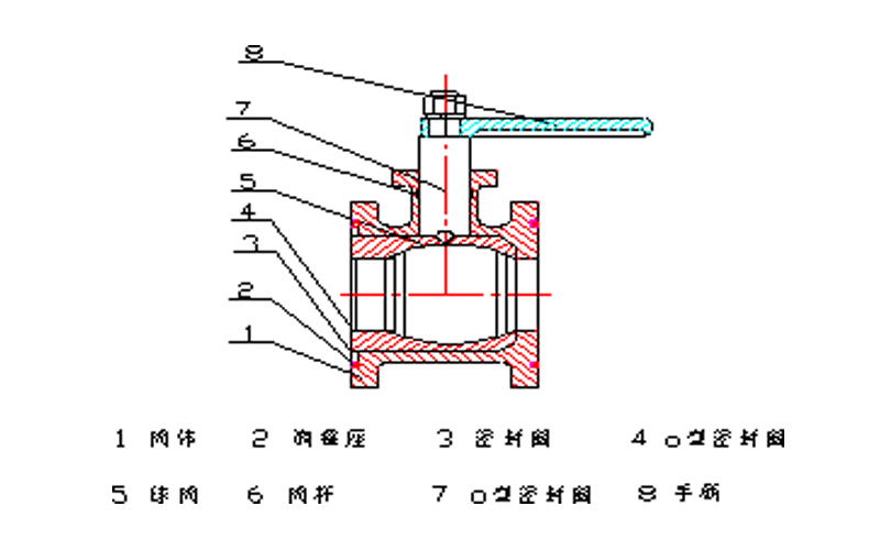 加油車自流口閥門采用的為球閥,結構如圖所示。球閥由閥體調整座、密封環、球閥、閥桿手柄等部件組成,搬轉手柄90°即可實現球閥的開關,球閥配合松緊可旋轉調整以達到要求。